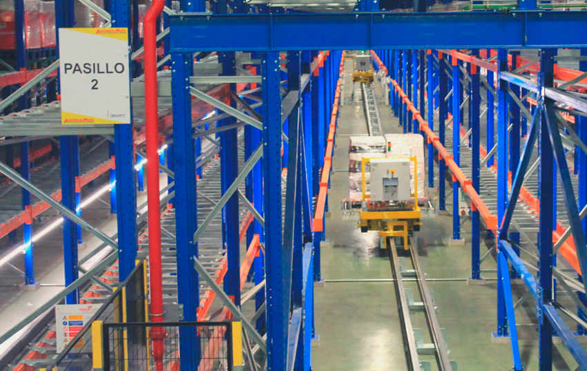 Esta novedosa solución que está en marcha desde junio de 2019 incluye un sistema de transportadores y de electrovía para el transporte continuo de palets. Este sistema de transporte cubre desde la Recepción de la mercancía hasta la Expedición mediante canales de gravedad. La capacidad de almacenamiento es de unos 8.000 Europalets o bien 16.000 medios palets. La solución logística de Dematic para Ahorramas lleva a cabo la preparación de pedidos para las tiendas de Ahorramas tanto de Europalets como de medios palets.
