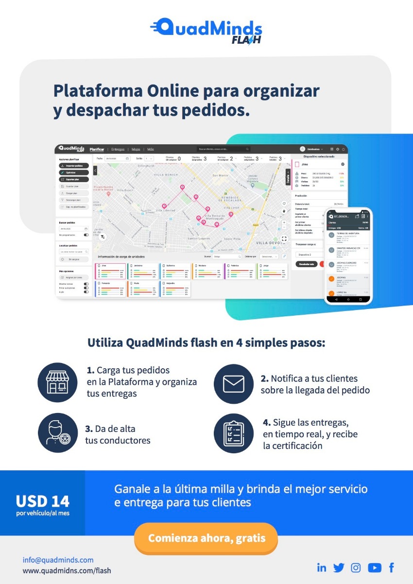 En el marco del crecimiento de la venta Online, la modalidad de entrega a domicilio se ha vuelto la «única» opción para los negocios. A su vez organizar esos repartos puede volverse algo complejo, insumiendo mucho tiempo. Para resolver esa problemática, QuadMinds lanzó al mercado la herramienta online y de prueba gratuita, QuadMinds Flash.