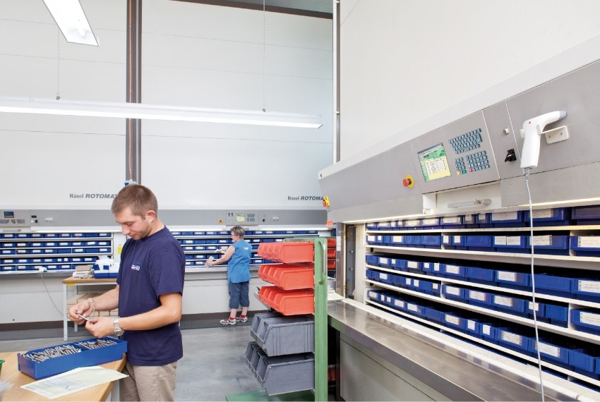 Configurados para preparar 15 pedidos simultáneamente, los dos sistemas automáticos verticales de VRC presentan los artículos ferreteros de manera organizada y segura, aumentando al máximo la productividad de cada operario de almacén.