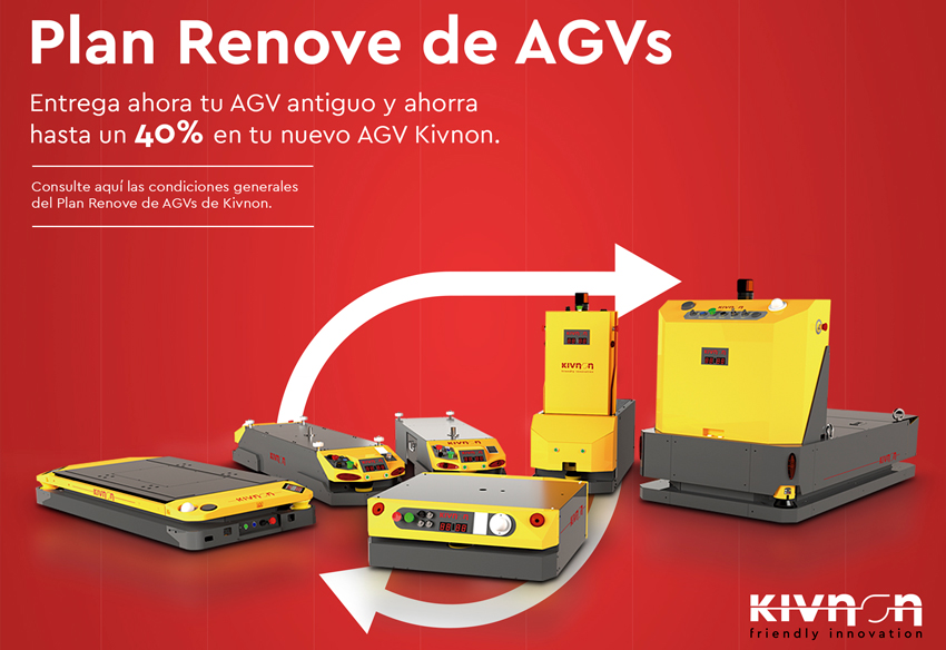 Los clientes podrán entregar sus AGVs antiguos y ahorrar hasta un 40% en su AGV nuevo de Kivnon. El grupo internacional Kivnon, especializado en la automatización de procesos industriales mediante vehículos autoguiados (AGVs), lanza su plan Renove de AGVs para ayudar al sector industrial en la nueva era post-coronavirus Covid-19. La razón de esta promoción es dar apoyo a las empresas en su transformación hacia la Industria 4.0.