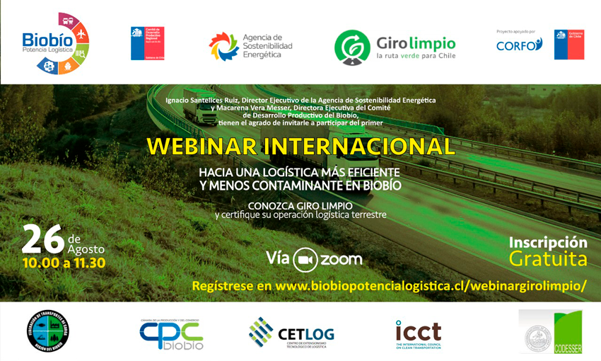 La Agencia de Sostenibilidad Energética, dependiente del Ministerio de Energía, en conjunto con el programa Biobío Potencia Logística, de Corfo, la Cámara de la Producción y del Comercio de Concepción, la Federación de Transportistas de Carga por Carretera del Biobío y el Centro de Extensionismo Tecnológico en Logística, realizarán el miércoles 26 de agosto el primer webinar internacional “GIRO LIMPIO: HACIA UNA LOGÍSTICA MÁS EFICIENTE Y MENOS CONTAMINANTE EN BIOBÍO”. Giro Limpio es un programa de acceso gratuito, cuyo objetivo es certificar que la operación logística terrestre de una empresa es sostenible en términos económicos y ambientales. Una empresa con sello Giro Limpio tiene menor huella ambiental y menores costos por consumo de combustible.