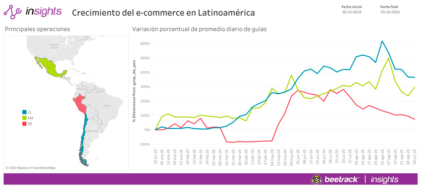 Un sondeo elaborado por Beetrack, compañía de tecnología asociada a la logística de despachos, observó el crecimiento del e-commerce en los distintos países de Latinoamérica en que opera, en el período comprendido entre la semana del 30 de diciembre de 2019 hasta la del 5 de octubre de 2020. En él se observa cómo en los meses de pandemia, la actividad ligada a este tipo de comercio se incrementó explosivamente, con peaks cercanos al 300%, en el caso de Perú; casi 500% en México; y sobre 600% en Chile, marcados principalmente por grandes eventos del comercio en cada país. Sin embargo, en las últimas semanas se ha podido observar cómo las cifras han tendido a estabilizarse en un nuevo equilibrio.