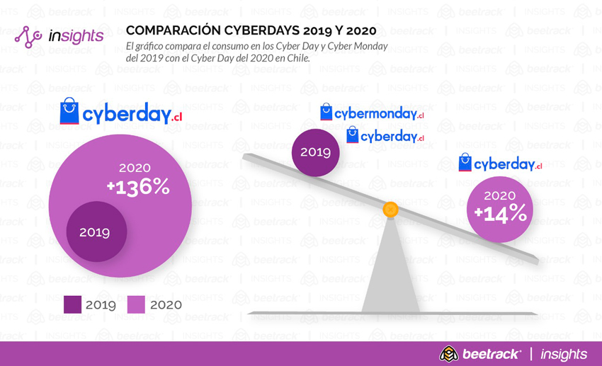 De acuerdo con un sondeo elaborado por Beetrack, compañía de tecnología asociada a logística de última milla, durante la semana 36 del año, que comprende los días 31 de agosto al 6 de septiembre, los despachos experimentaron un crecimiento de 662,4%, en comparación a la semana del 2 de marzo. Las altas cifras equivalen a lo ocurrido en dos eventos de esta especie en 2019. Específicamente, se superaron así en un 14% las ventas conjuntas de las ediciones 2019 del Cyber Monday y el Cyber Day.