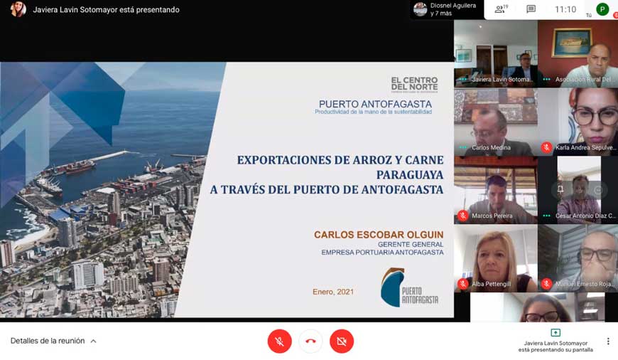 El encuentro denominado “Exportaciones de arroz y carne paraguaya a través del Puerto de Antofagasta a los mercados de países de Asia Pacifico” moderada por Carlos Medina Director de la Cámara Chileno Paraguaya de Comercio, permitió generar una mesa de trabajo entre empresarios, Puerto Antofagasta y servicios públicos vinculados a las exportaciones. Lo anterior en la búsqueda de ofrecer la plataforma de exportación de la región de Antofagasta como un trampolín para las exportaciones, de carne, granos y otros alimentos, hacia los países del Asia-Pacífico.