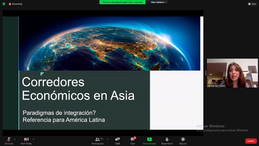 Cerca de 100 interesados de Chile, Argentina, Paraguay y Brasil participaron en el Seminario Virtual “La experiencia de los Corredores de Comercio a lo largo del mundo”, realizado este lunes 21, a pesar del feriado en Chile y Argentina y que se debió programar a las 9 de la mañana, debido a que el Profesor Xie Wenze, de la Academia China de Ciencias Sociales, expuso desde Pekín, con una diferencia de 12 horas con Chile. Se refirió a “La nueva Ruta de la Seda y sus relaciones con América Latina” señalando que “los Corredores logísticos y digitales serán la base para la interconexión de América Latina con el Asia Pacífico”, señalando que el Corredor Bioceánico que unirá a Brasil, Paraguay, Argentina y Chile será un medio importante para esa conectividad, así como para incentivar las inversiones chinas y de otros países en cadenas regionales de producción y de valor.