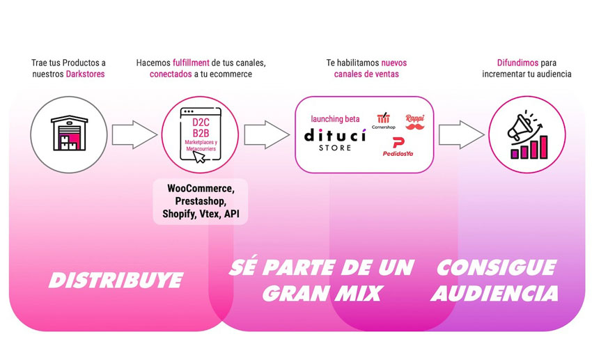 ¿Cómo funciona? En Ditucí, actualmente se encargan de la logística y fullfillment del e-commerce de 140 marcas: es decir, de almacenar, preparar y despachar los pedidos al consumidor. Sin una inversión inicial, las pymes llevan sus productos a la darkstore de Ditucí. Luego, con el mismo stock con el que haces los despachos de tu “directo al consumidor”, Ditucí te habilita nuevos canales comerciales, como lo es el marketplace.
