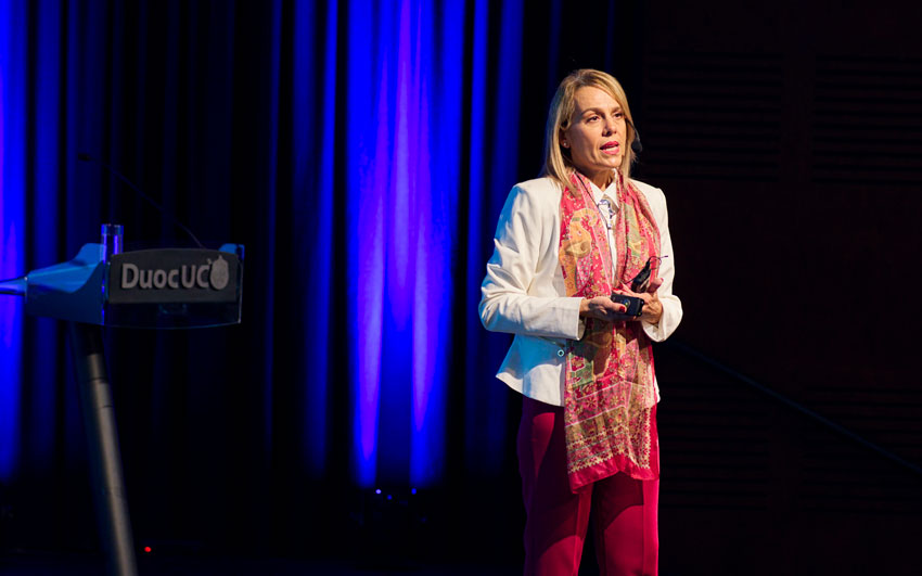 La Gerente General de la Asociación Logística de Chile, Cynthia Perisic, lideró la charla inaugural realizada en el Teatro de Duoc UC sede Viña del Mar.