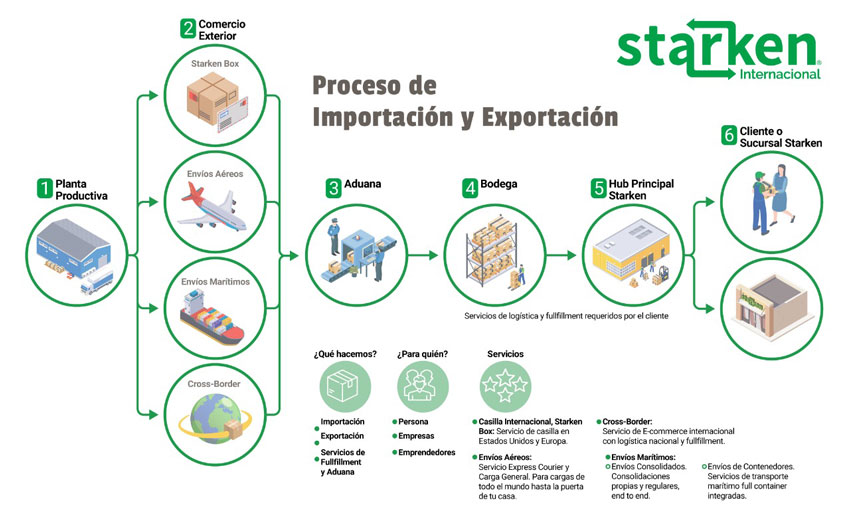 Asimismo, la empresa incorporará “Envíos Aéreos”, con servicio Express Courier Internacional de importación y exportación de paquetería de 0-50 kg, y de carga general a partir de 50kg, para otros segmentos y necesidades, ambos para clientes que busquen rapidez y eficiencia en cargas pequeñas, medianas y grandes. Por otra parte, se habilitará «Starken Box», una casilla internacional, para personas naturales y/o emprendedores y empresas, ubicada en Miami para facilitar compras en EE.UU. Gracias a Starken Box el cliente podrá comprar como si viviese en EEUU, teniendo acceso además a una trazabilidad total y en tiempo real, un envío rápido a Chile, y un despacho que podrá ser tanto a su casa como a cualquier sucursal Starken de su preferencia.