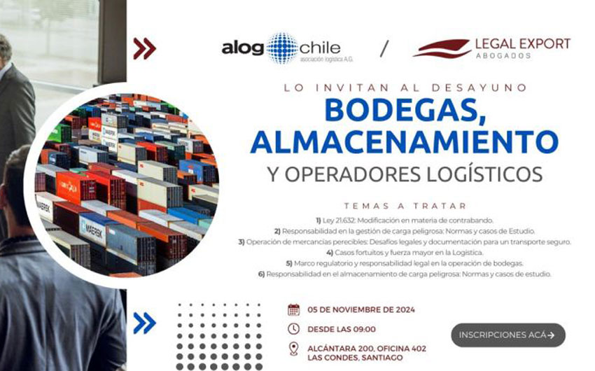 En esta línea, el día 05 de noviembre, Legal Export Abogados, junto a ALOG desarrollarán el Desayuno orientado a los actores del mundo del bodegaje y almacenamiento logístico (OPL). El evento se llevará a cabo en Alcántara 200, oficina 402, Las Condes y la inscripción es totalmente gratuita, tanto para empresas socias como empresas no socias de ALOG Chile.