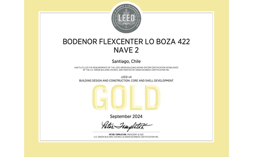 El complejo Bodenor Flexcenter dio otro importante paso en sostenibilidad: su parque logístico Lo Boza 422 Nave 2 obtuvo la certificación LEED con un total de 62 puntos, lo que lo sitúa en el nivel “Gold”.