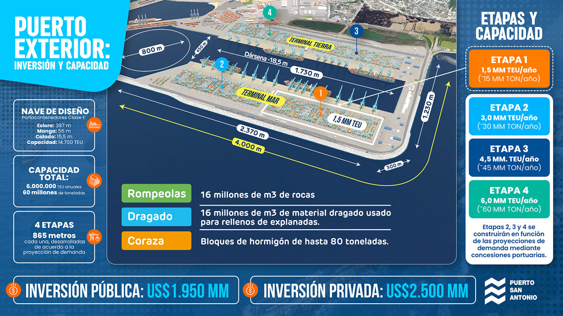 El proyecto Puerto Exterior es la obra portuaria más importante en la historia de Chile y contempla una inversión público-privada de US$ 4.450 millones. Con dos terminales de 1.730 metros cada uno, triplicará la capacidad actual de transferencia hasta 6 millones de TEU al año, con una infraestructura preparada para atender simultáneamente ocho naves Post New Panamax, de 400 metros de largo.
